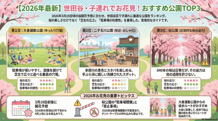 2026年の東京の桜開花は3月19日前後が予想されています。「子どもを連れてどこでお花見しようかな」と計画中のパパ・ママに向けて、世田谷区で子連れ花見におすすめの公園をTOP3でご紹介します。